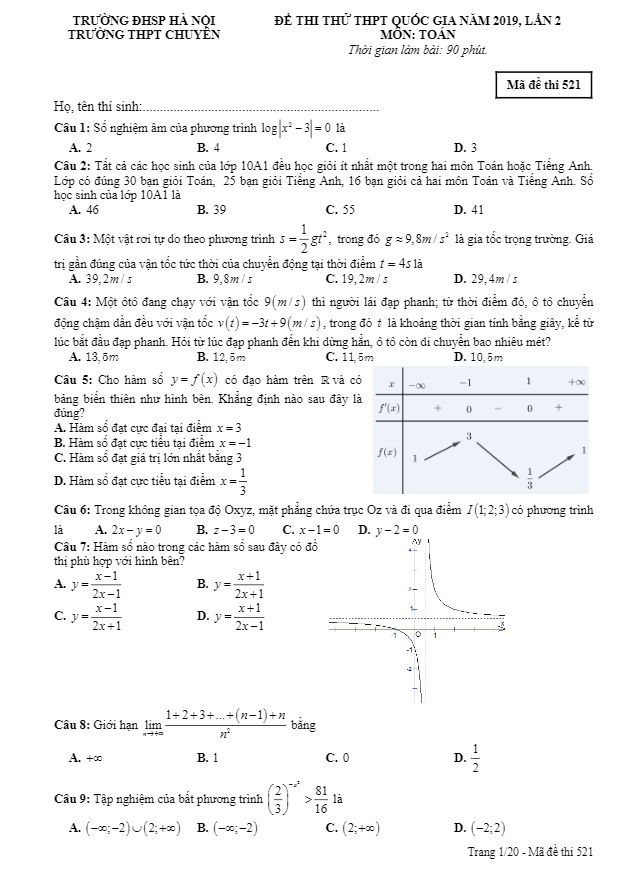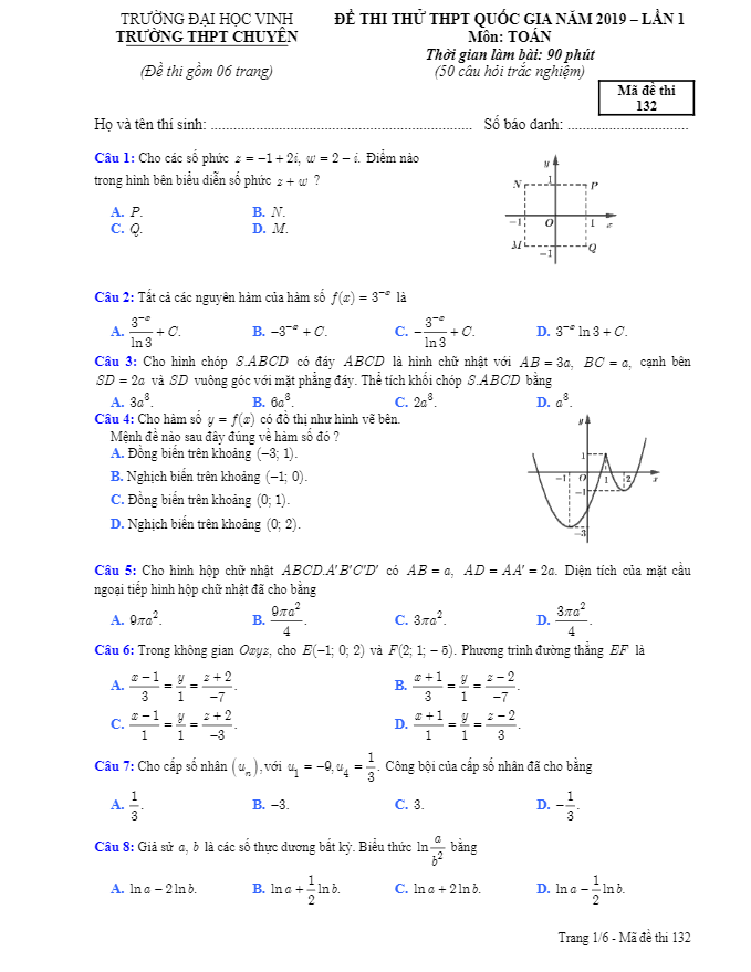 Đề thi thử Toán THPT Quốc gia 2019 lần 1 trường THPT chuyên Đại học Vinh – Nghệ An