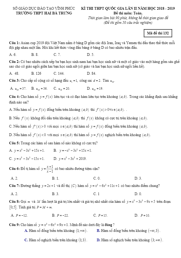 Đề thi thử Toán THPT Quốc gia 2019 lần 2 trường Hai Bà Trưng – Vĩnh Phúc