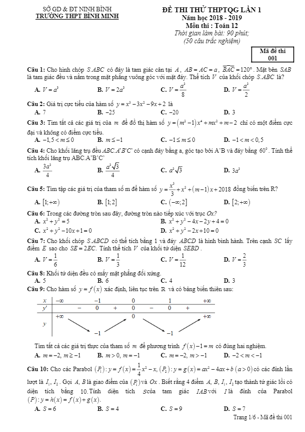 Đề thi thử THPTQG 2019 môn Toán trường THPT Bình Minh – Ninh Bình lần 1