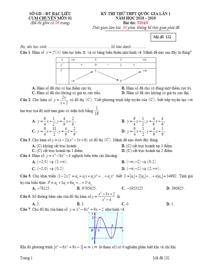 Đề thi thử THPT Quốc gia 2019 môn Toán cụm chuyên môn 01 – sở GD và ĐT Bạc Liêu lần 1