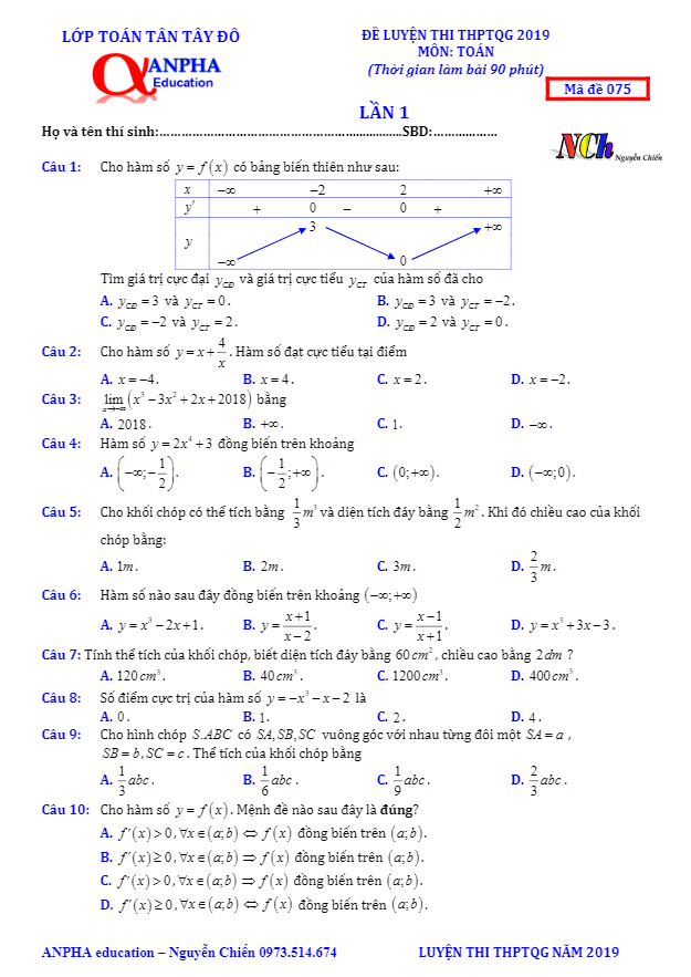 Đề Thi Thử THPT Môn Toán 2019