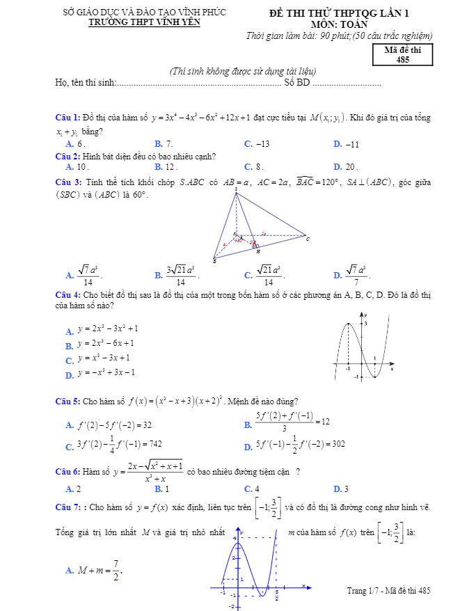 Đề thi thử THPTQG 2019 môn Toán trường THPT Vĩnh Yên – Vĩnh Phúc lần 1