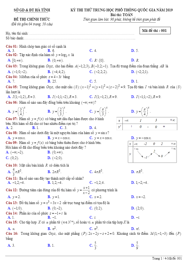 Đề thi thử THPT Quốc gia 2019 môn Toán sở GD&ĐT Hà Tĩnh