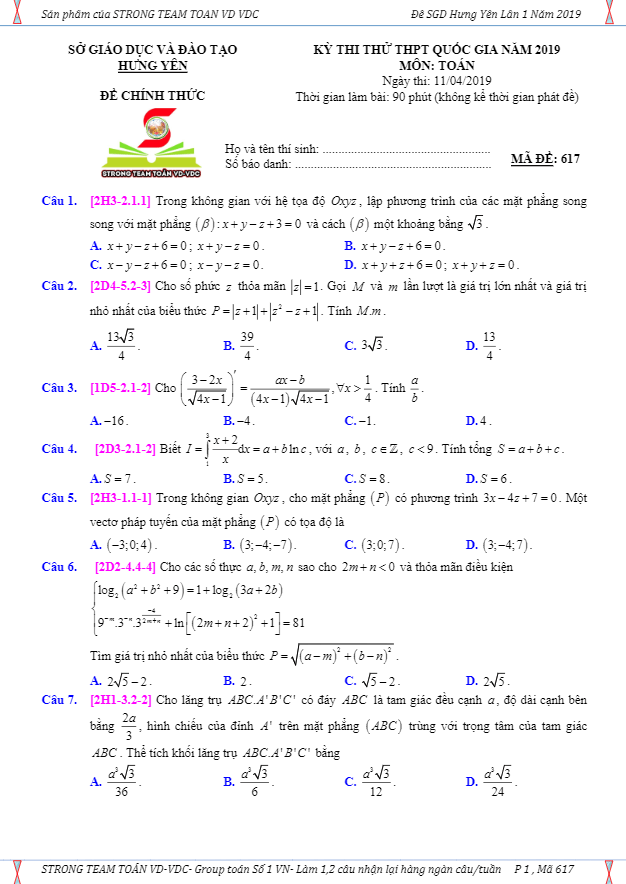 Đề thi thử THPT Quốc gia 2019 môn Toán sở GD&ĐT Hưng Yên