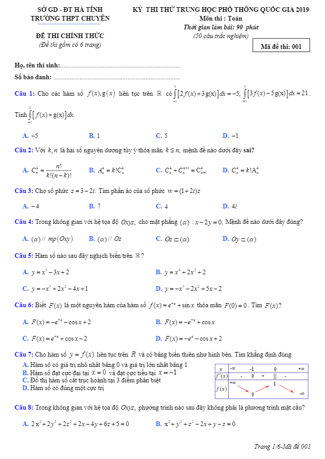 Đề thi thử THPT Quốc gia 2019 môn Toán trường THPT chuyên Hà Tĩnh