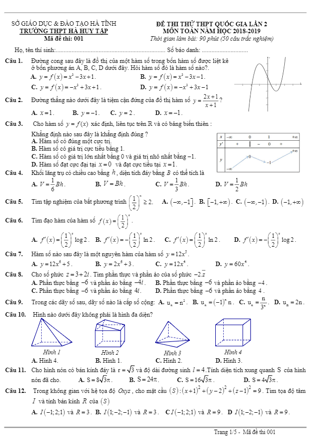 Đề thi thử Toán THPT Quốc gia 2019 lần 2 trường Hà Huy Tập – Hà Tĩnh