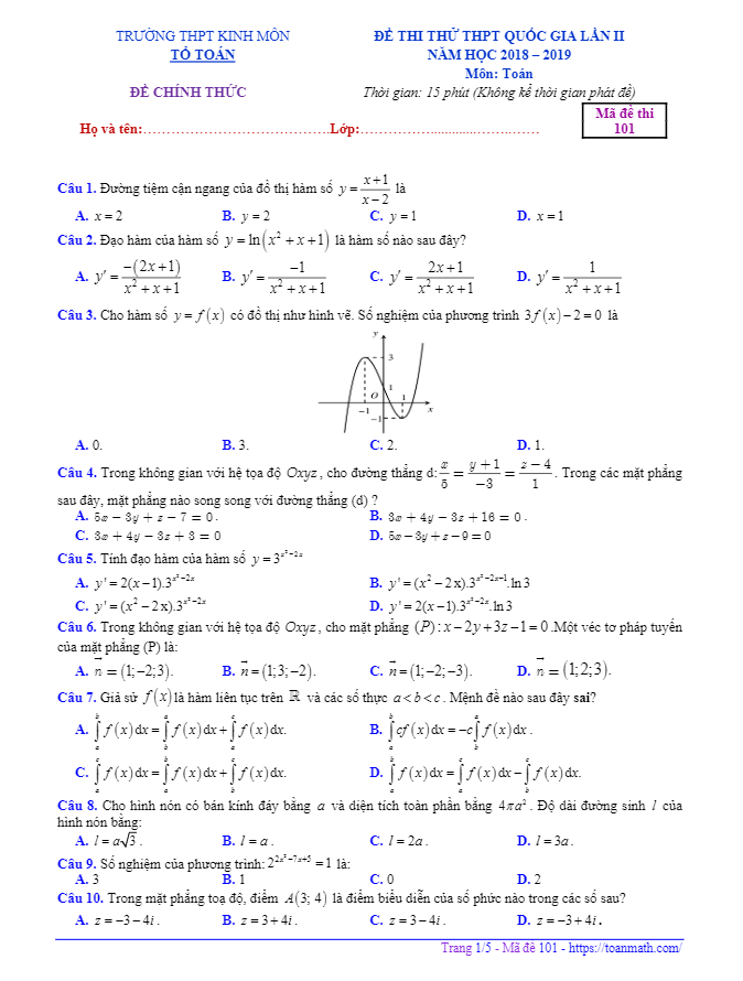 Đề thi thử Toán THPT Quốc gia 2019 lần 2 trường Kinh Môn – Hải Dương