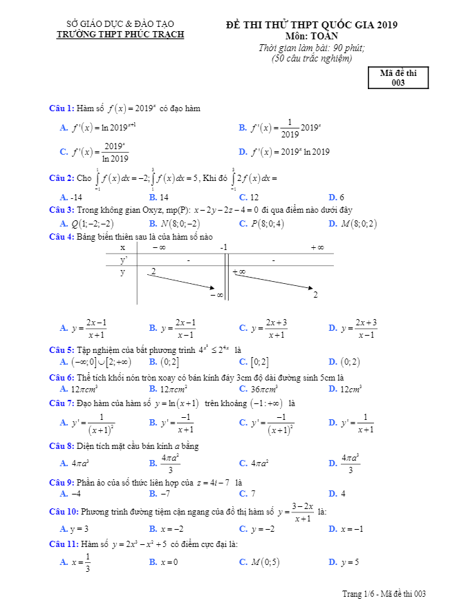 Đề Thi Thử THPT Môn Toán 2019