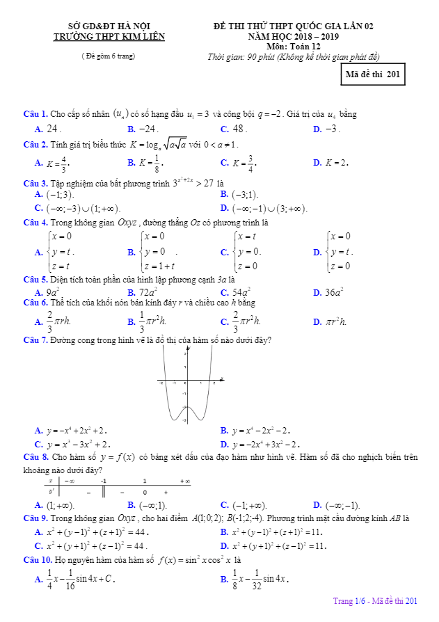 Đề thi thử Toán THPT Quốc gia 2019 lần 2 trường THPT Kim Liên – Hà Nội