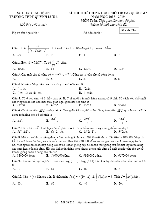 Đề thi thử Toán THPT Quốc gia 2019 trường Quỳnh Lưu 3 – Nghệ An