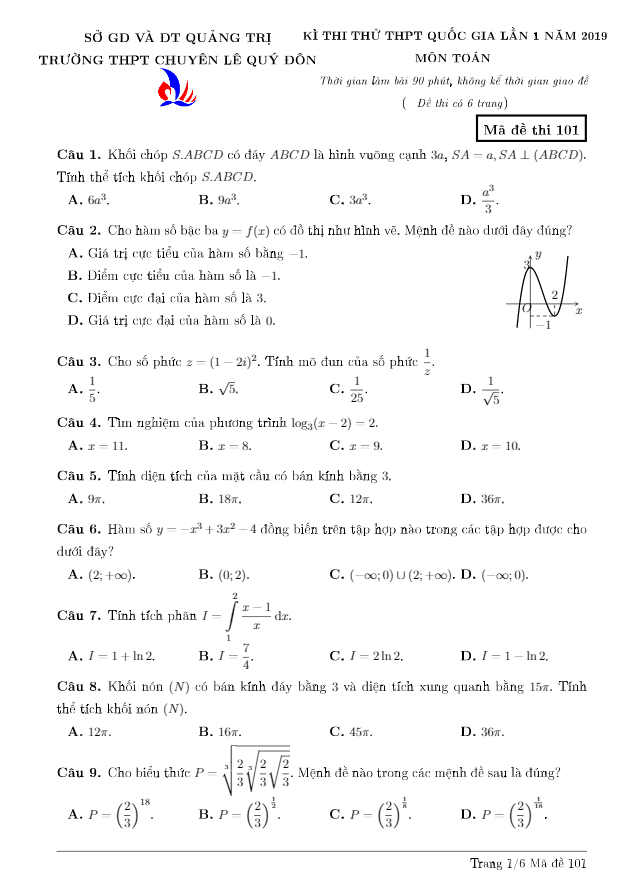 Đề thi thử Toán THPTQG 2019 lần 1 trường chuyên Lê Quý Đôn – Quảng Trị