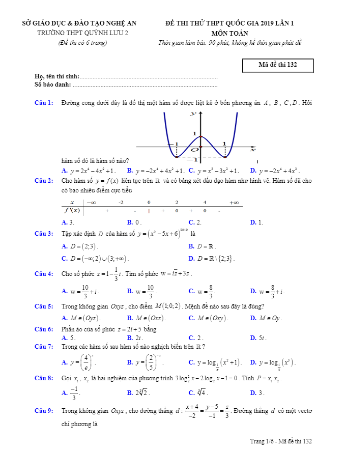 Đề thi thử Toán THPTQG 2019 lần 1 trường Quỳnh Lưu 2 – Nghệ An