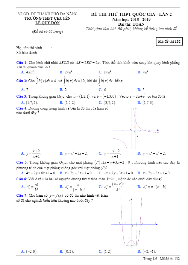 Đề thi thử Toán THPTQG 2019 lần 2 trường chuyên Lê Quý Đôn – Đà Nẵng
