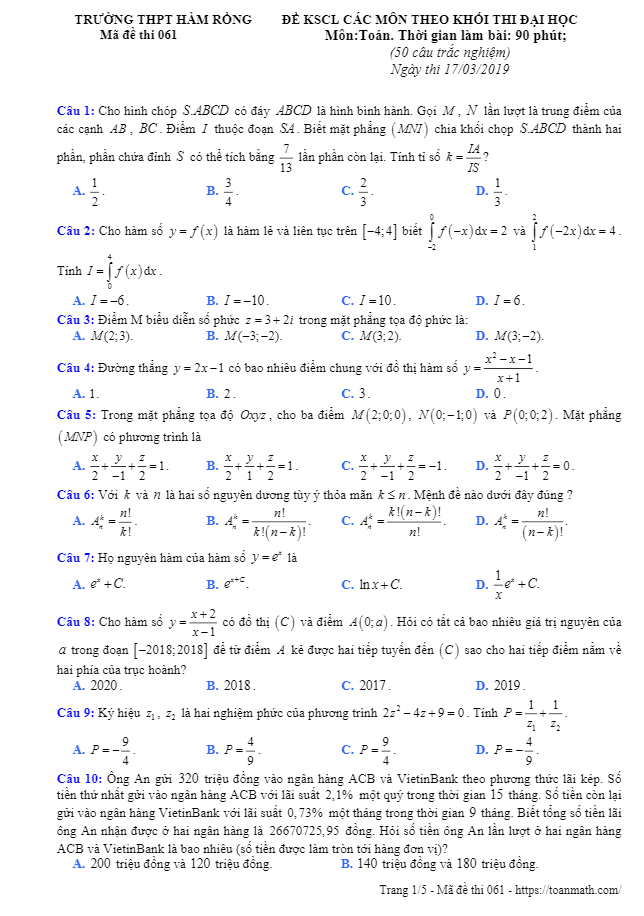 Đề KSCL môn Toán thi ĐH 2019 trường THPT Hàm Rồng – Thanh Hóa lần 2