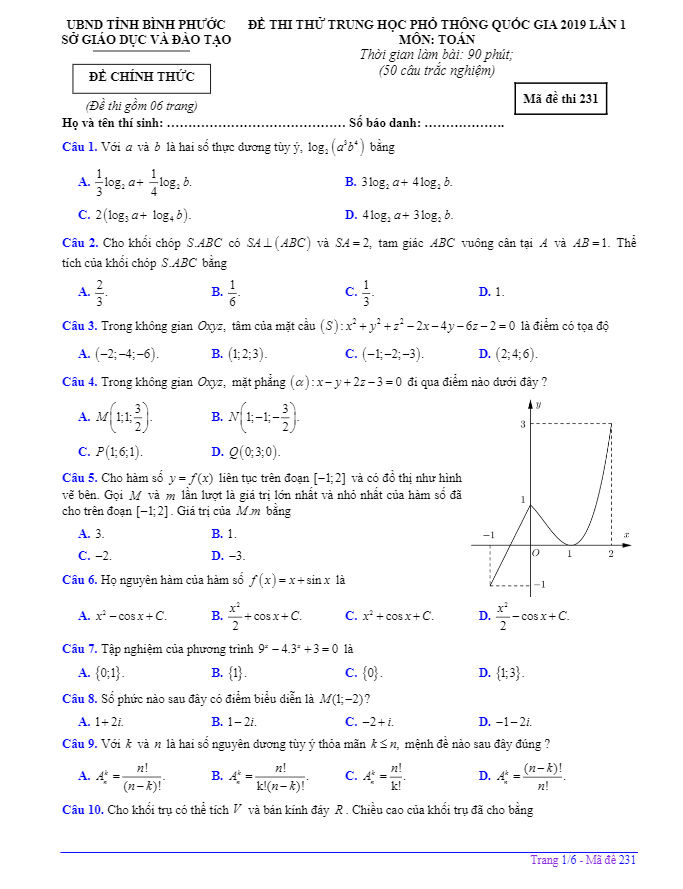 Đề thi thử THPT QG 2019 môn Toán lần 1 sở GD&ĐT Bình Phước
