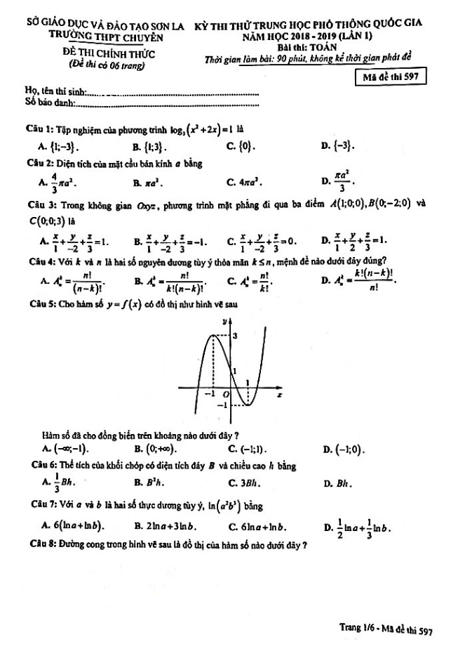Đề thi thử THPT Quốc gia 2019 môn Toán lần 1 trường THPT chuyên Sơn La