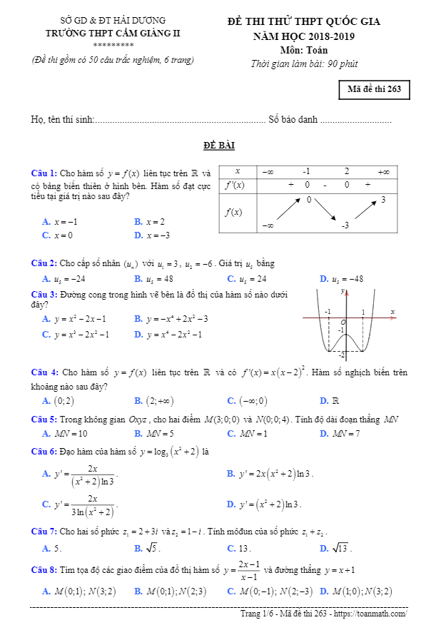 Đề thi thử THPT Quốc gia 2019 môn Toán trường Cẩm Giàng II – Hải Dương