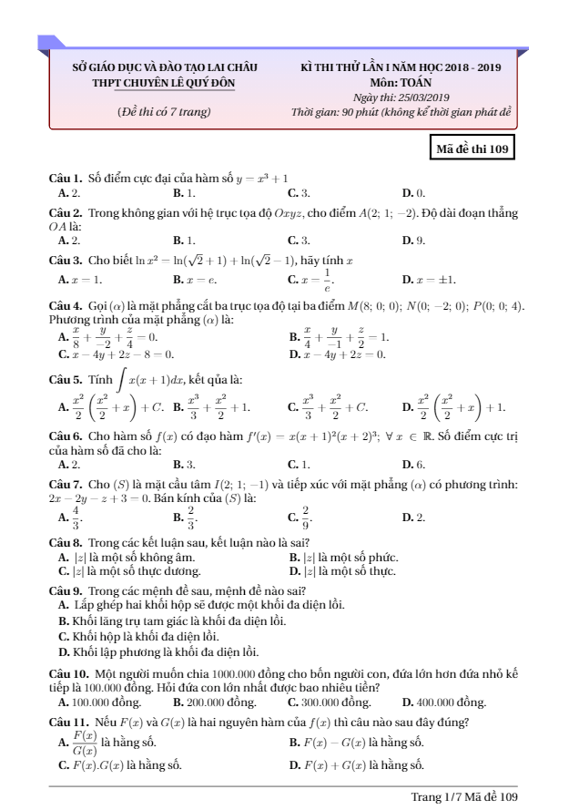 Đề thi thử Toán lần 1 năm 2018 – 2019 trường chuyên Lê Quý Đôn – Lai Châu