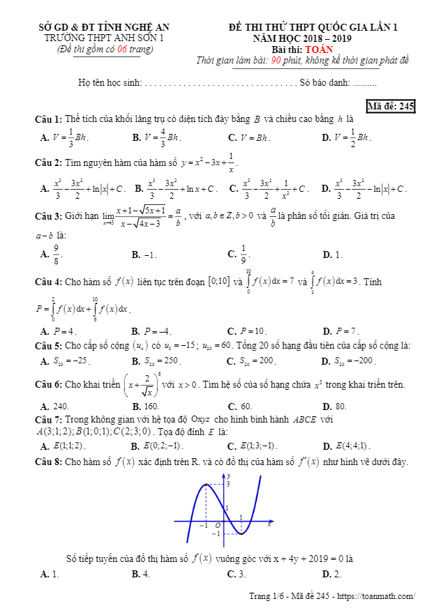 Đề thi thử Toán THPT Quốc gia 2019 lần 1 trường Anh Sơn 1 – Nghệ An