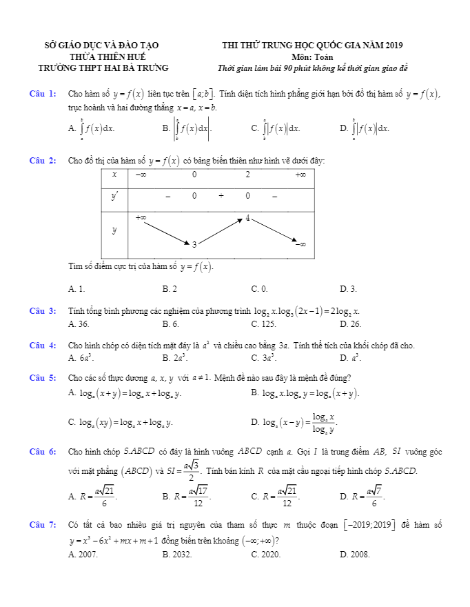 Đề thi thử Toán THPT Quốc gia 2019 lần 2 trường Hai Bà Trưng – TT Huế