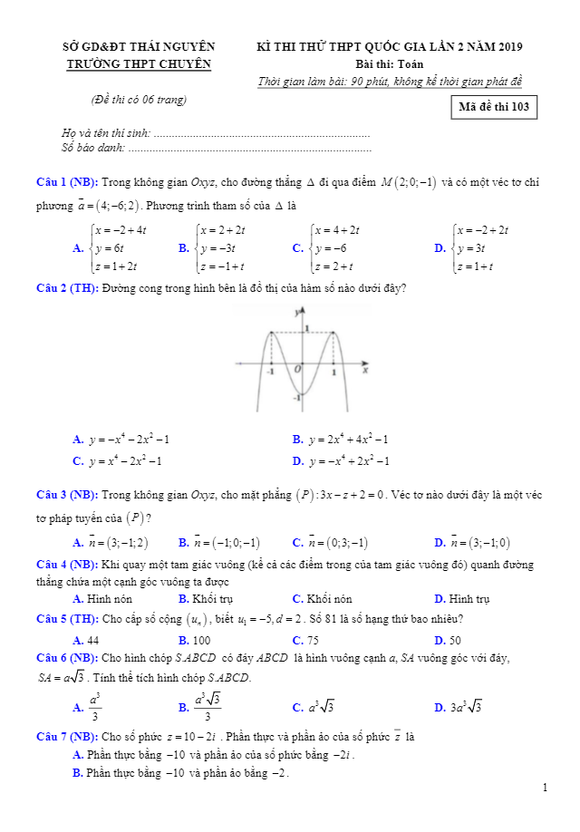 Đề thi thử Toán THPT Quốc gia 2019 lần 2 trường THPT chuyên Thái Nguyên