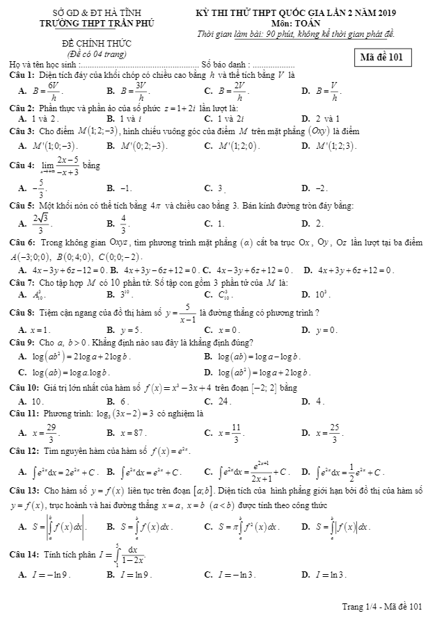 Đề thi thử Toán THPT Quốc gia 2019 lần 2 trường Trần Phú – Hà Tĩnh