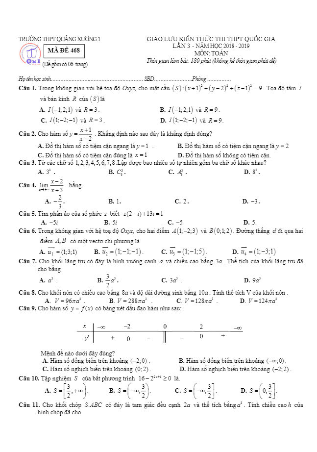 Đề thi thử Toán THPT Quốc gia 2019 lần 3 trường THPT Quảng Xương 1 – Thanh Hóa