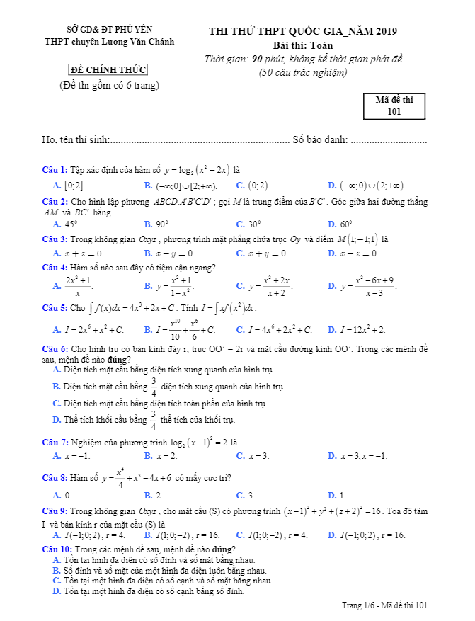 Đề thi thử Toán THPT Quốc gia 2019 trường chuyên Lương Văn Chánh – Phú Yên