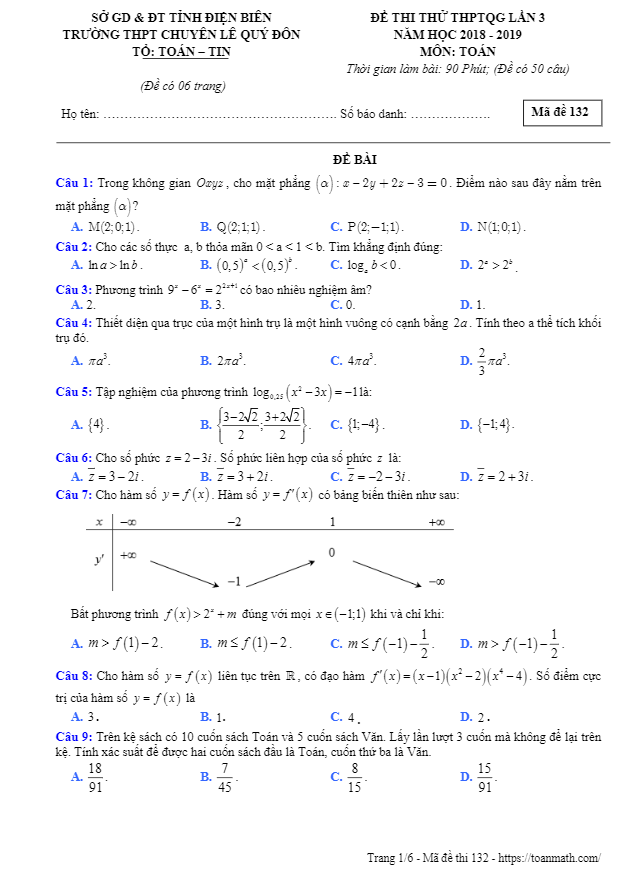 Đề thi thử Toán THPTQG 2019 lần 3 trường chuyên Lê Quý Đôn – Điện Biên