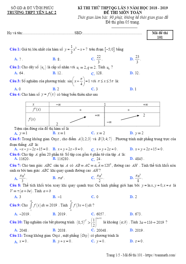 Đề thi thử Toán THPTQG 2019 lần 3 trường THPT Yên Lạc 2 – Vĩnh Phúc