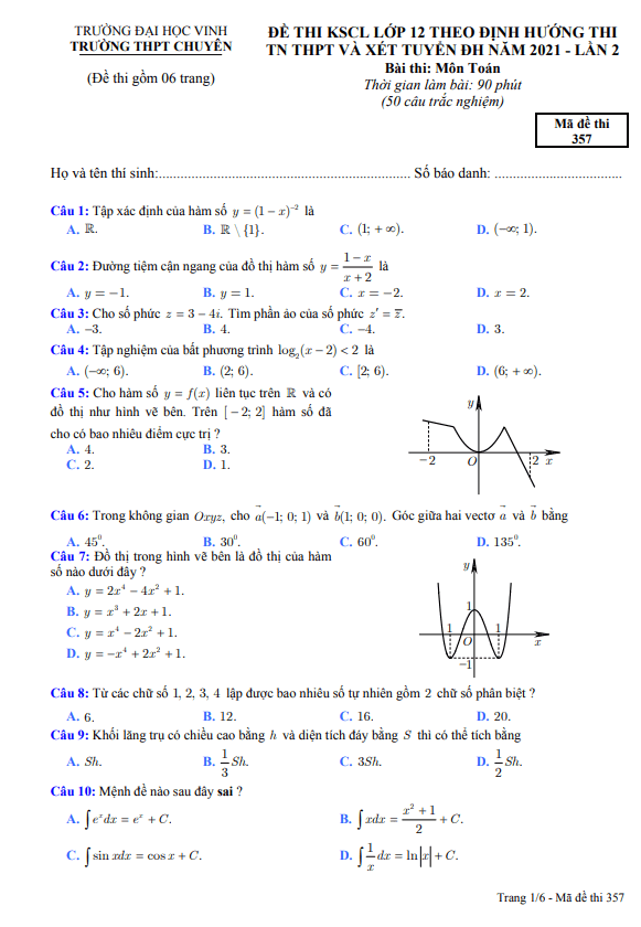 Đề thi thử TN THPT 2021 môn Toán lần 2 trường THPT chuyên ĐH Vinh – Nghệ An