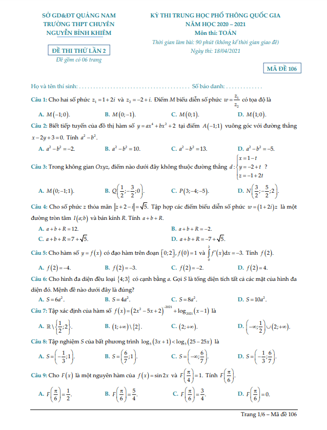 Đề thi thử Toán THPT 2021 lần 2 trường chuyên Nguyễn Bỉnh Khiêm – Quảng Nam