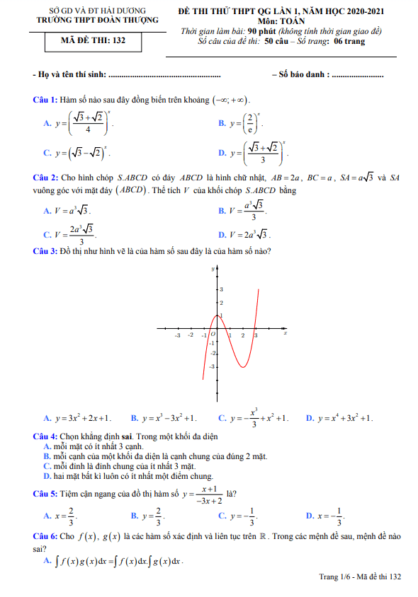 Đề thi thử Toán THPT QG 2021 lần 1 trường THPT Đoàn Thượng – Hải Dương