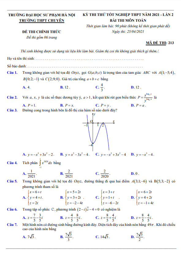 Đề thi thử Toán TN THPT 2021 lần 2 trường THPT chuyên Sư phạm Hà Nội