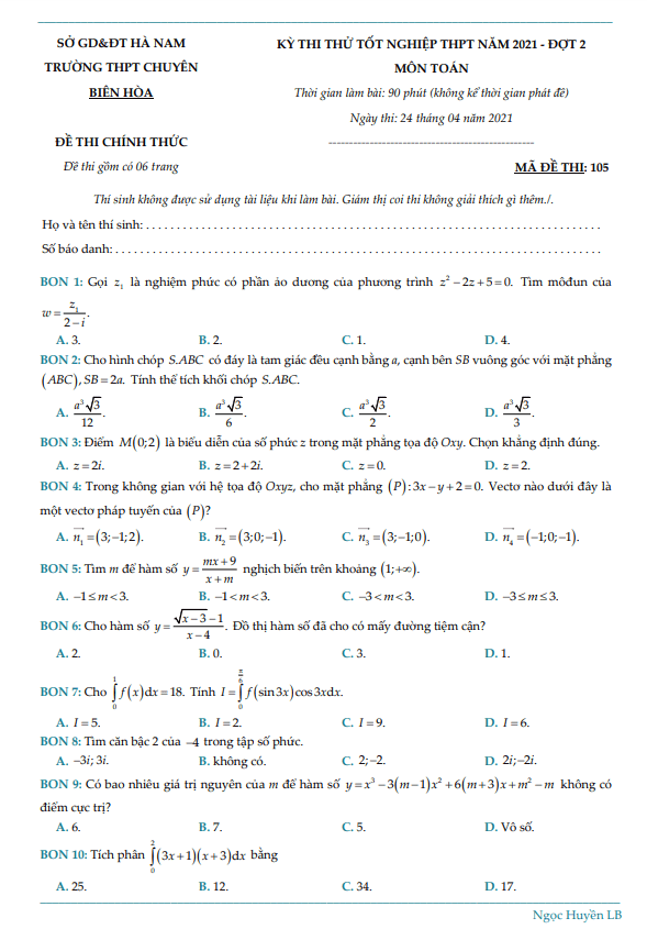 Đề thi thử Toán TN THPT 2021 trường chuyên Biên Hòa – Hà Nam (Đợt 2)