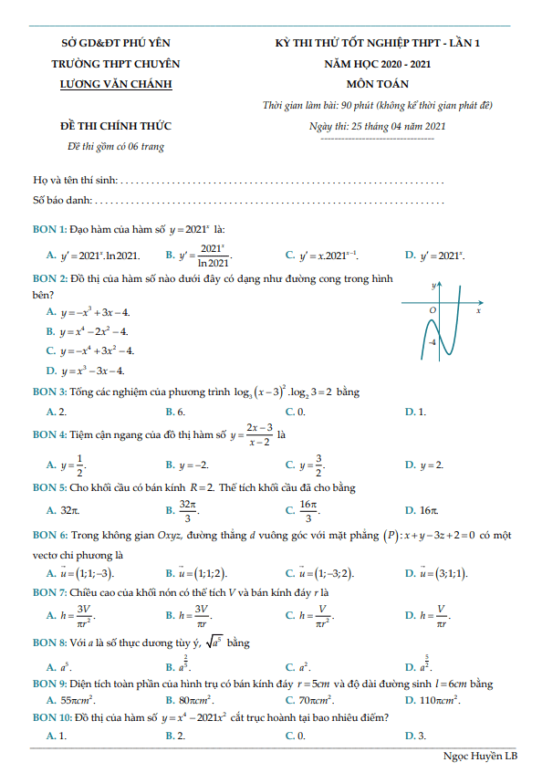 Đề thi thử Toán TNTHPT 2021 lần 1 trường chuyên Lương Văn Chánh – Phú Yên