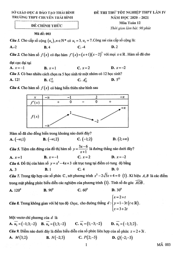Đề thi thử Toán tốt nghiệp THPT 2021 lần 4 trường THPT chuyên Thái Bình