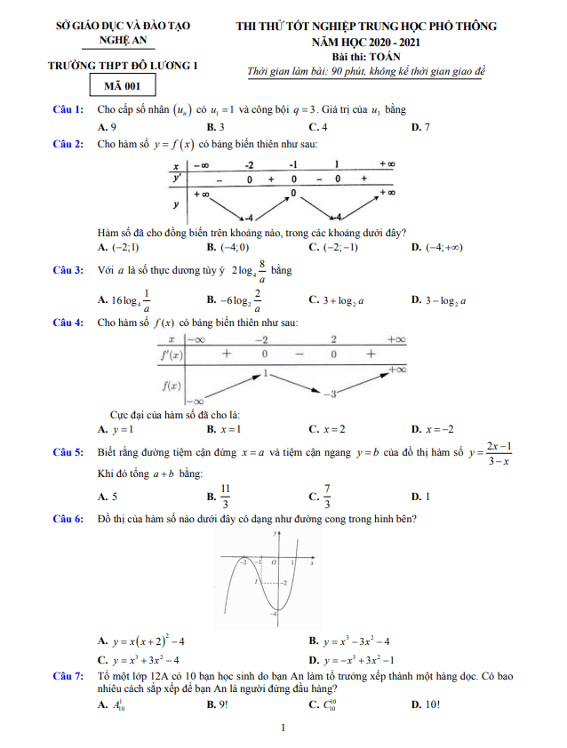 Đề thi thử tốt nghiệp THPT 2021 môn Toán trường THPT Đô Lương 1 – Nghệ An