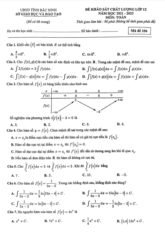 Đề khảo sát chất lượng môn Toán 12 năm 2021 – 2022 sở GD&ĐT Bắc Ninh
