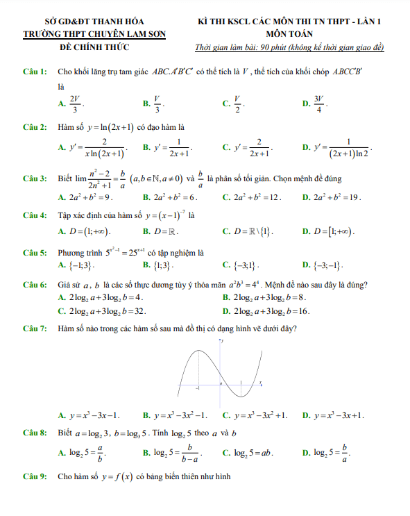 Đề KSCL Toán thi tốt nghiệp THPT 2022 lần 1 trường chuyên Lam Sơn – Thanh Hóa
