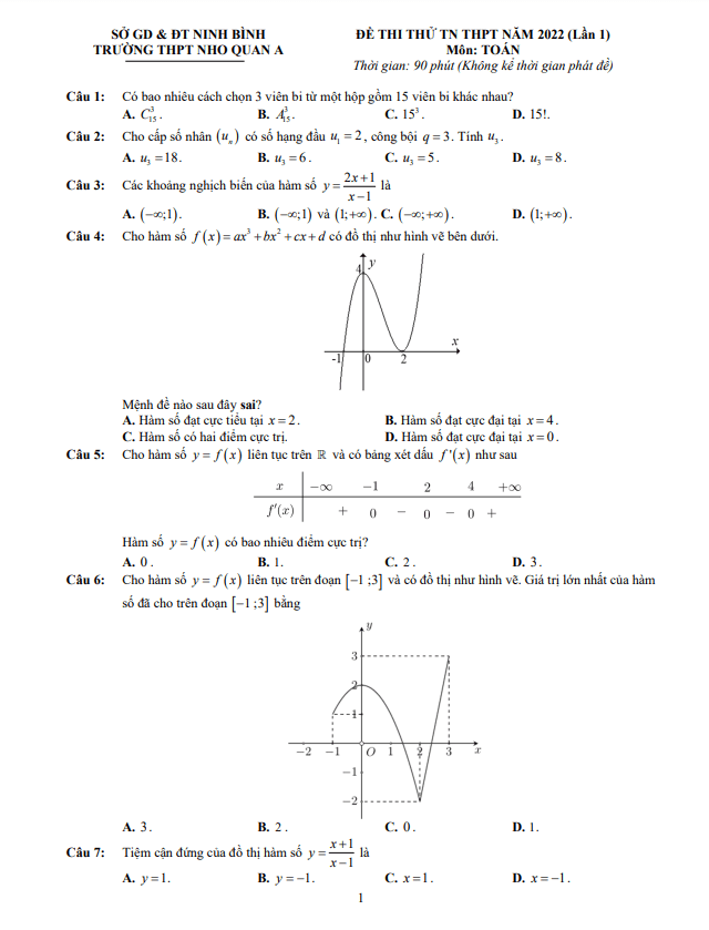 Đề thi thử TN THPT năm 2022 môn Toán lần 1 trường THPT Nho Quan A – Ninh Bình