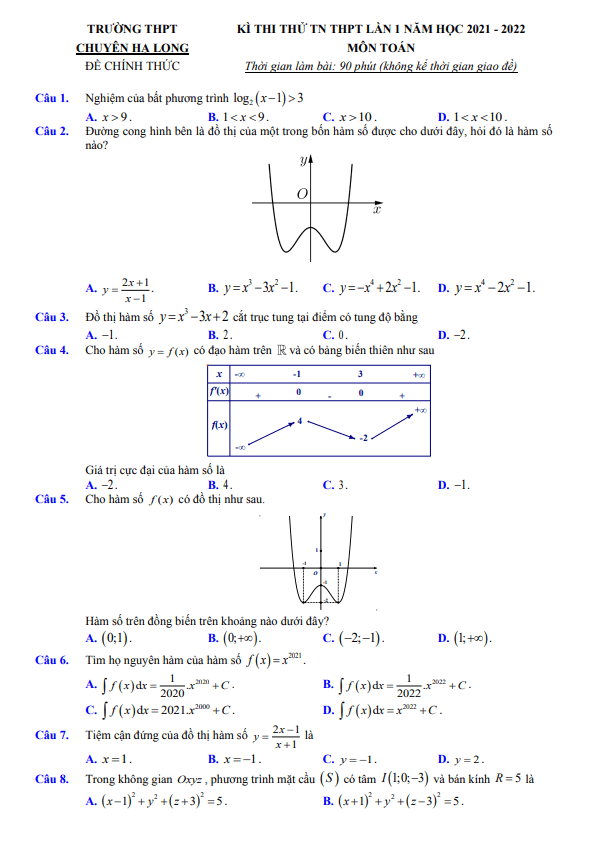 Đề thi thử Toán TN THPT 2022 lần 1 trường chuyên Hạ Long – Quảng Ninh
