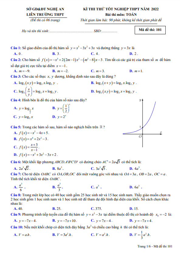 Đề thi thử tốt nghiệp THPT 2022 môn Toán liên trường THPT – Nghệ An