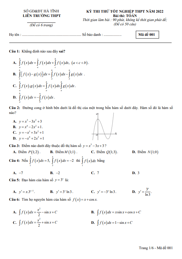 Đề thi thử tốt nghiệp THPT năm 2022 môn Toán liên trường THPT – Hà Tĩnh