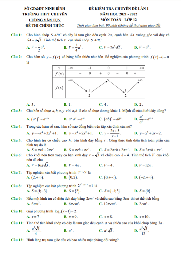 Đề thi chuyên đề Toán 12 lần 1 năm 2021 – 2022 trường chuyên Lương Văn Tụy – Ninh Bình