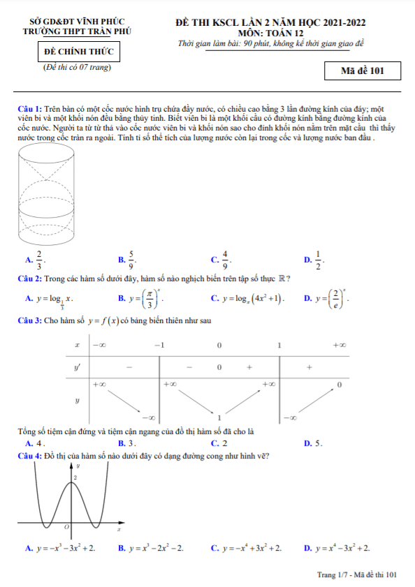 Đề thi KSCL Toán 12 lần 2 năm 2021 – 2022 trường THPT Trần Phú – Vĩnh Phúc