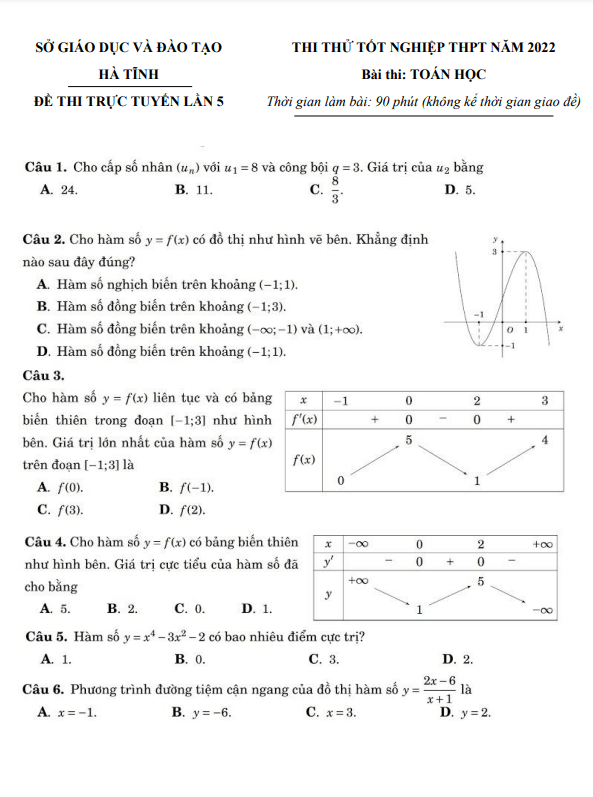Đề thi thử TN THPT 2021 – 2022 môn Toán trực tuyến lần 5 sở GD&ĐT Hà Tĩnh