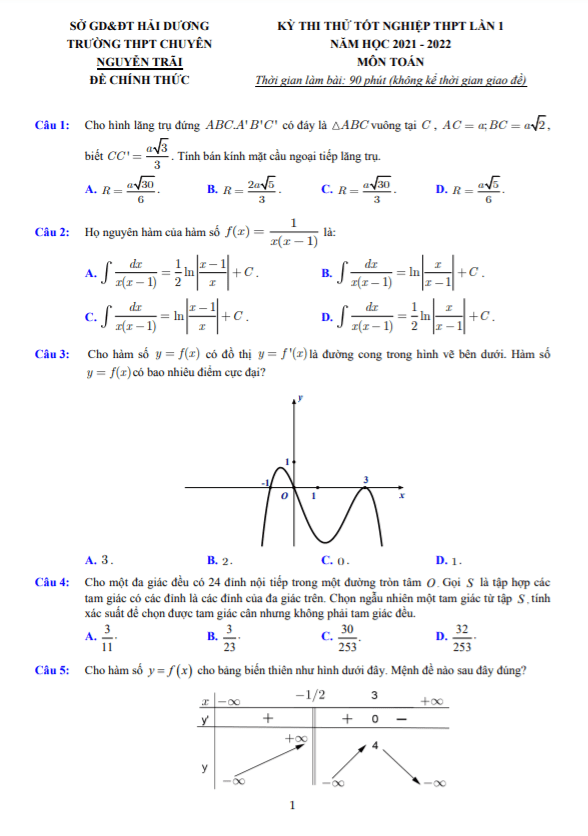 Đề thi thử Toán TN THPT 2022 lần 1 trường chuyên Nguyễn Trãi – Hải Dương
