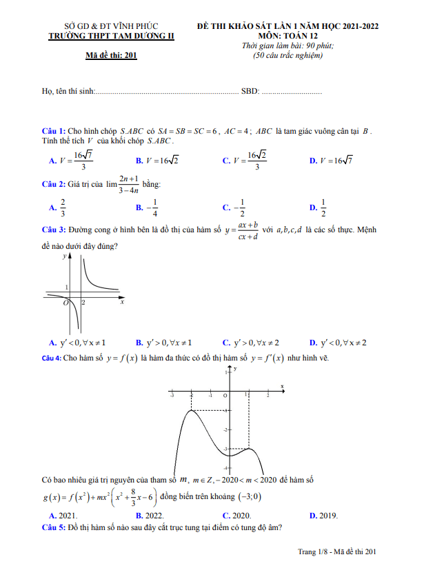 Đề khảo sát Toán 12 lần 1 năm 2021 – 2022 trường THPT Tam Dương 2 – Vĩnh Phúc