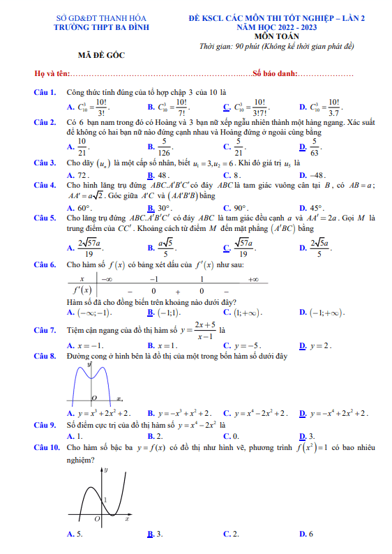 Đề KSCL Toán thi tốt nghiệp THPT 2023 lần 2 trường THPT Ba Đình – Thanh Hóa